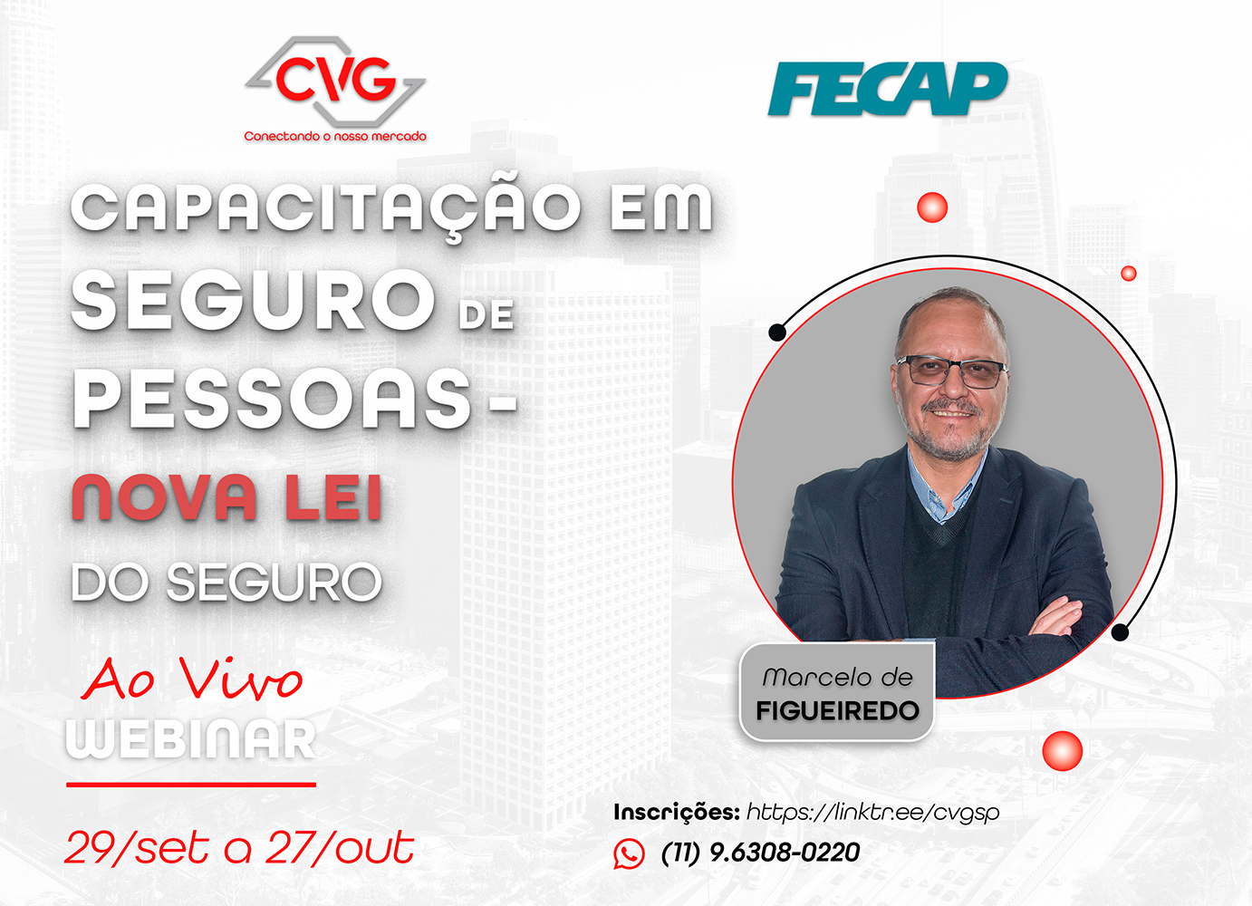 Profissionais do mercado de seguros desempregados (seguradoras ou corretoras): Entre em contato com o CVG/SP pelo WhatsApp (11) 9 6308-0220 e solicite o seu cupom de desconto.